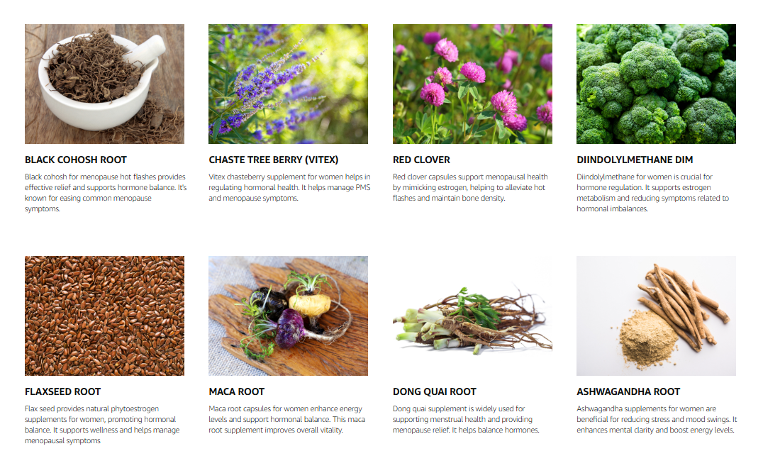 | Supports | Hormone balance, menopause relief, bloating, vaginal health, and energy |