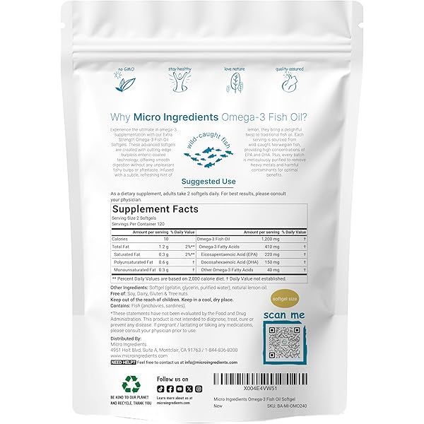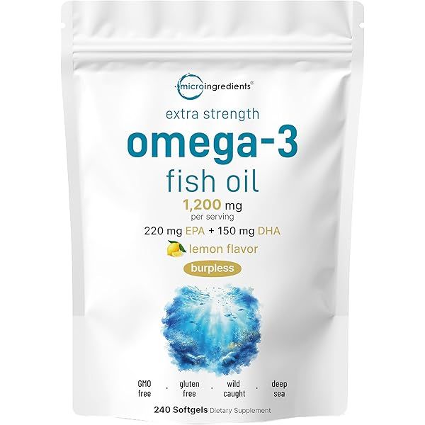 Micro Ingredients Extra Strength Omega 3 Fish Oil Supplements 1,200mg Per Serving, 240 Softgels | Lemon Flavored | Burpless | Essential Fatty Acids | EPA 220mg + DHA 150mg | Deep Sea Fish