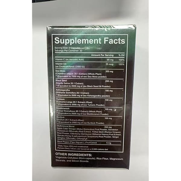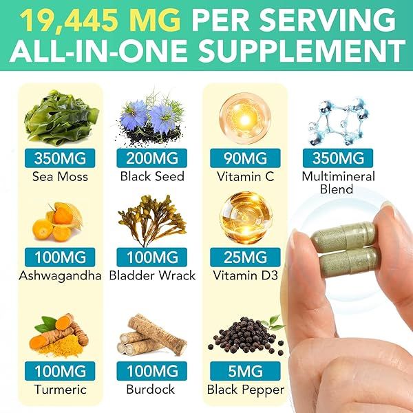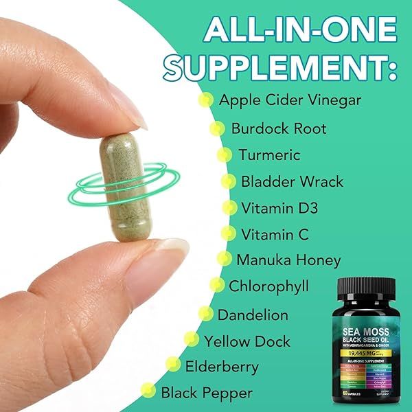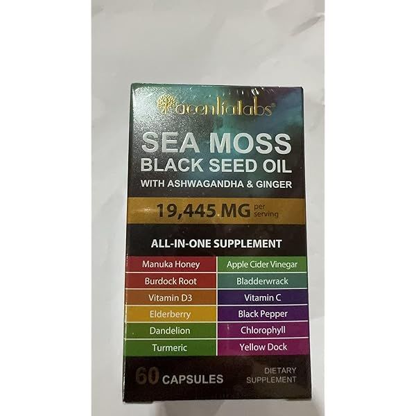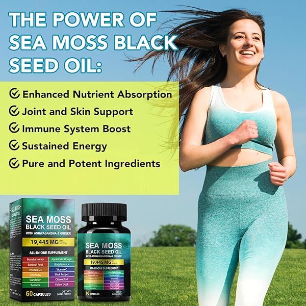 Sea Moss Black Seed Oil Ashwagandha Ginger, Sea Moss Capsule Supplement with Turmeric Burdock Root Bladderwrack Vitamin C Vitamin D3 Enhanced Immunity & Energy Black Seed Oil Capsule 60 Count