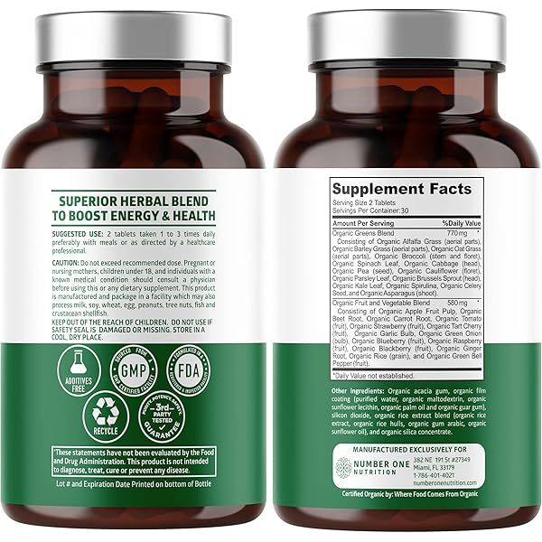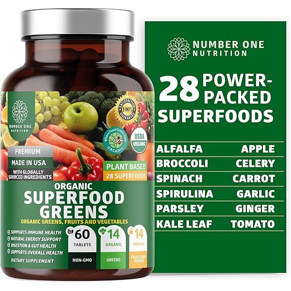 USDA Organic Superfood Greens [28 Powerful Ingredients] Natural Super Greens Capsules, Fruit and Veggie Supplement with Alfalfa, Beet Root and Ginger to Support Energy and Immunity, 60 Tablets
